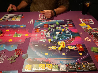 After all that, overall the game is very nice, has a lot of different things to think about and has bags of replayability hiding within its broad set of interlocking mechanics. The theme is enjoyable if you like your sci fi stuffs and the ever moving space board is something pretty fun and unusual and ties in a beautiful way to track the game timer and is thematically very strong. There is a very fine balance in determining whether a mission card is worth it or not - the game is incredibly short action wise, you'll probably get something in the region of 15 ish actions before the game finishes, which means every action really does count. Something that is entirely not obvious on your first game. The game definitely has an edge of allowing you to happily do stuff that is appallingly bad for your end game, but it feels like you're achieving something Euro style. The game has numerous of these "Euro pit traps", be wary of blindly applying your expert Euro skills over to this game. The tip here is to stay very focused on what earns you points, and how many actions it takes to achieve those points. Laying down a pointless mission or two, or spamming for dice - or spamming for anything - is going to cost you.